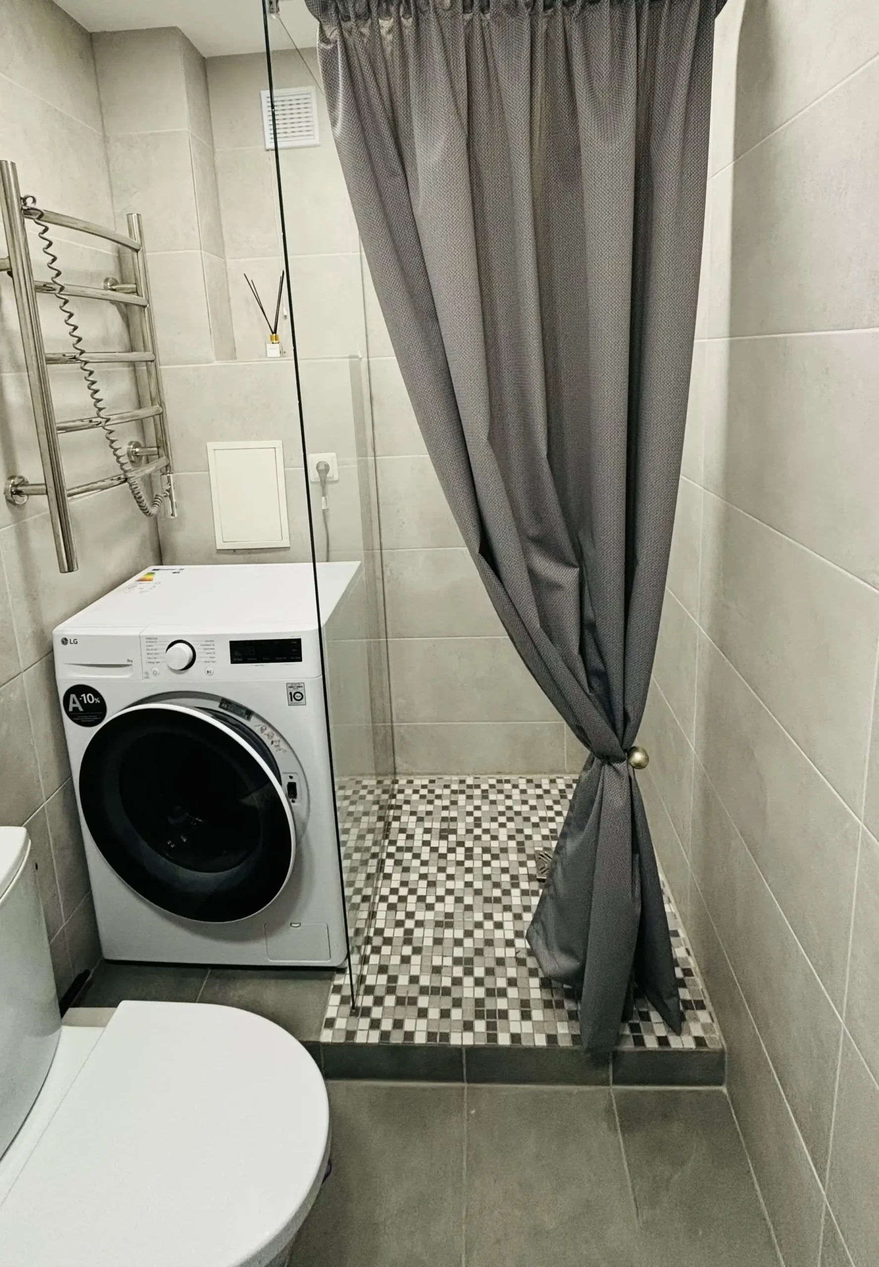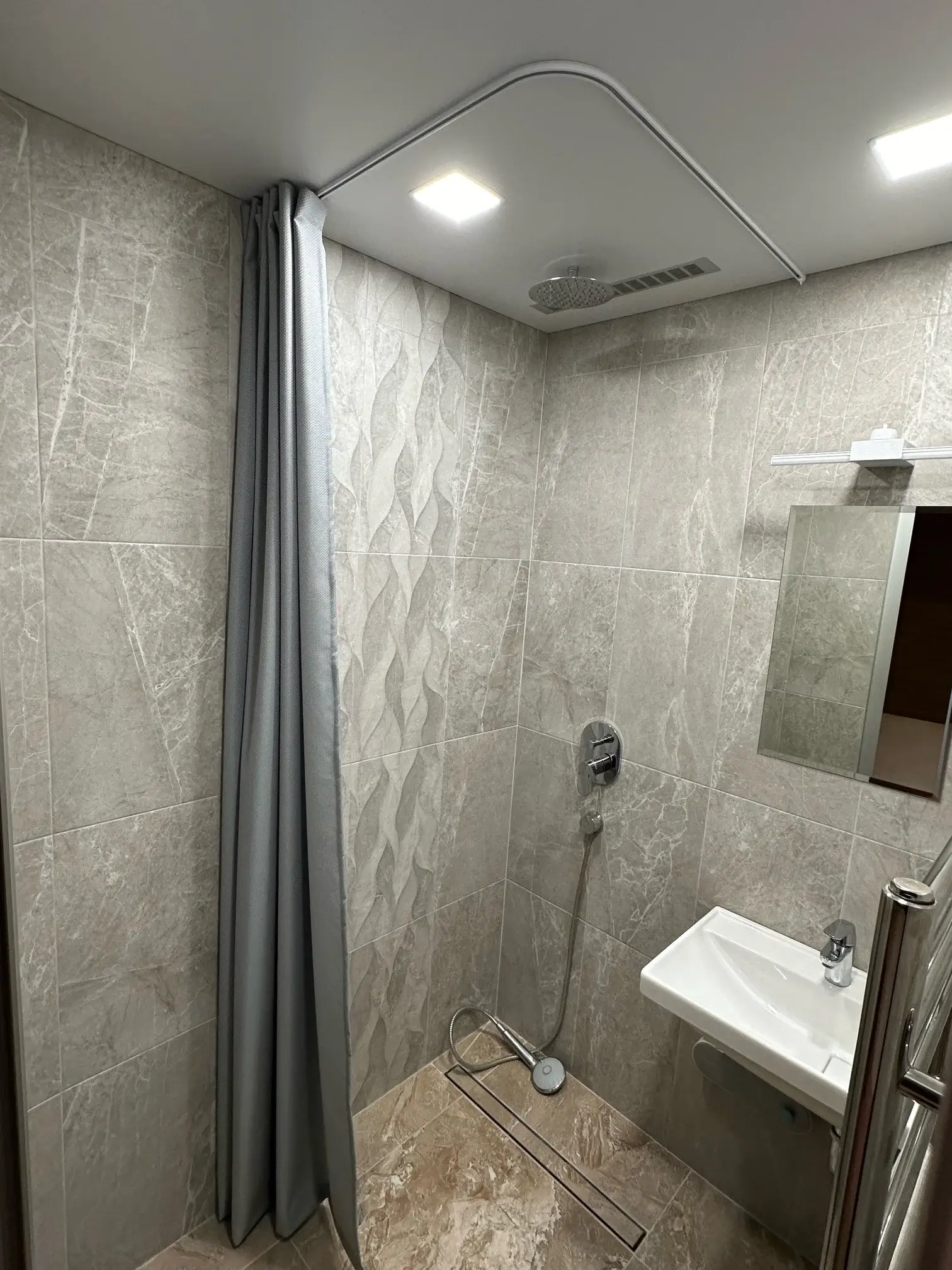 Į kainą įeina tik dušo užuolaida – karnizas ir kabliukai nepridedami.