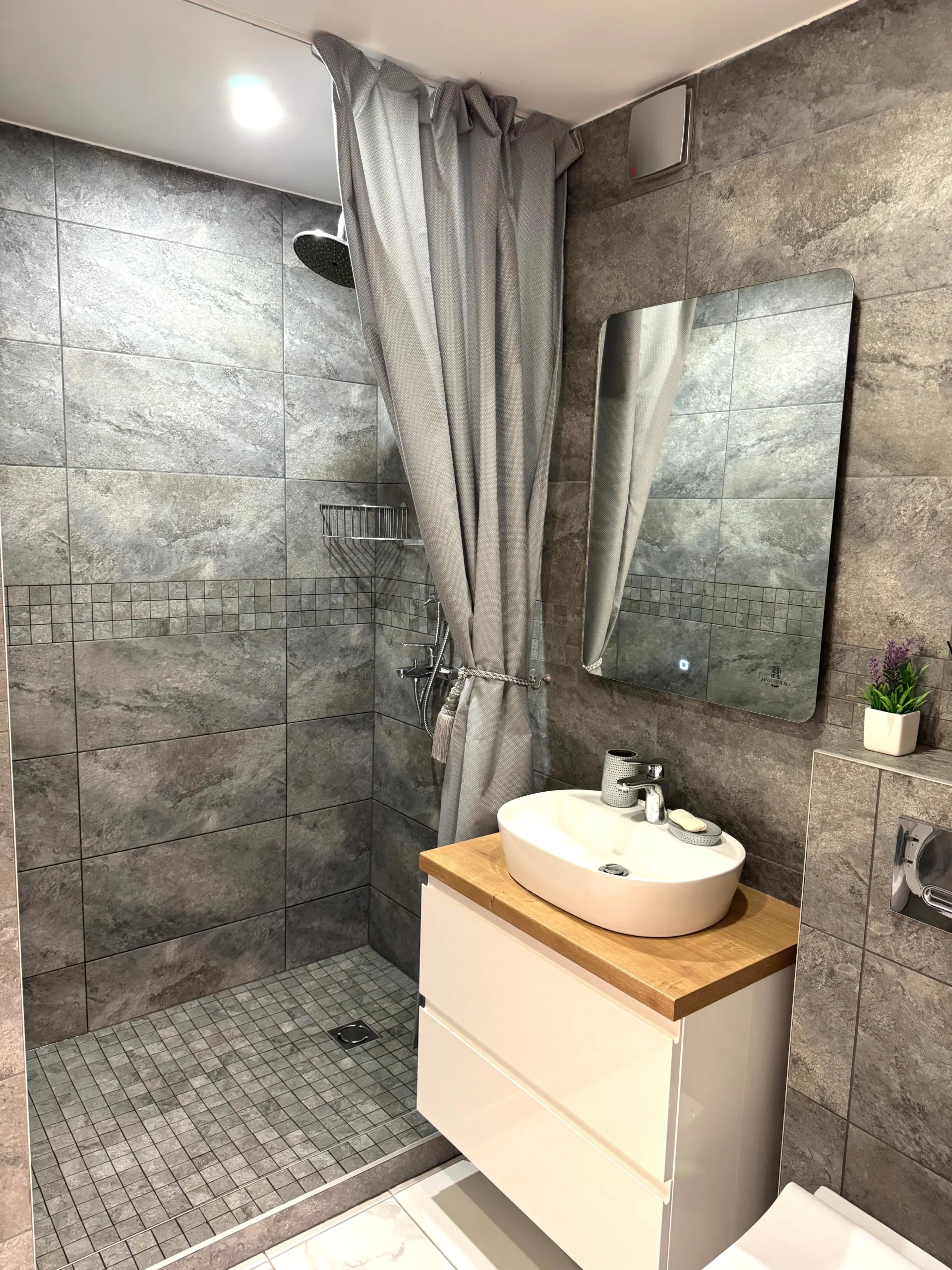 Stilinga, vandeniui atspari užuolaida su patogia juostele pakabinimui.